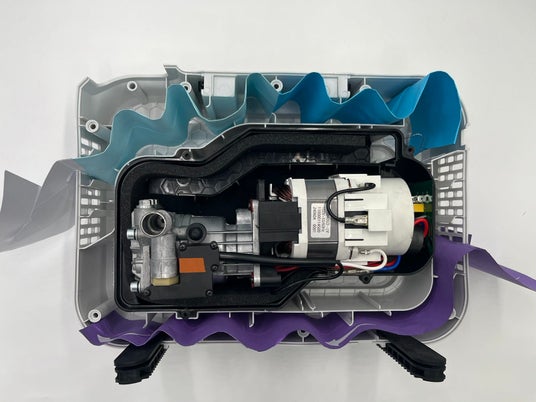 ハウジングを一から設計し、本体内部の吸気と排気の通気経路に互い違いのリブを配置し経路を長くすることで静音効果を高め、騒音値約20%カットを実現しました。