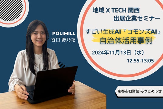 AIの社会実装を目指すスタートアップ、Polimill株式会社(ポリミル、本社:東京都港区、代表取締役:横田えり、以下Polimill社)は、11月12日(火)・13日(水)に京都市勧業館みやこめっせで開催される「地域×Tech関西」展示会に出展します。