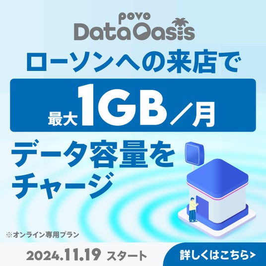 KDDI、沖縄セルラーは2024年11月19日から、povo2.0において、ローソン店舗への来店で、もれなくデータが無料でもらえる「povo Data Oasis」(ポヴォデータオアシス)の提供を開始します。ローソン店舗へ来店し、お手持ちのスマートフォンから特設サイトにアクセスいただくと、1回の来店につき0.1GB、最大で月10回(合計1GB)まで、データを無料でもらうことが可能です。