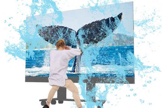 施工要らずの可搬式一体型LEDディスプレイ(高精細1.25mmピッチ/135インチ)を使用し、迫力の3D映像を展示します。