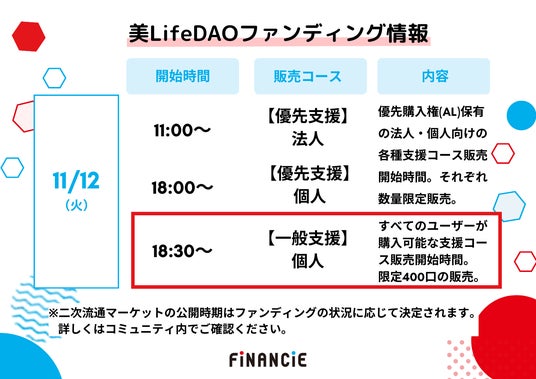 株式会社フィナンシェ(代表取締役:國光 宏尚、以下フィナンシェ)は、株式会社スマートリレーション(代表取締役:佐野 気理)が運営する美容健康コミュニティ「美LifeDAO」が本日11月12日よりFiNANCiEでファンディングを開始したことをお知らせいたします。