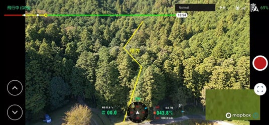 小型カメラドローンDJI mini3 Proを利用し、GISデータ(ライン、ポリゴン、ポイントデータ)のAR投影が可能です。mapry林業などで測量した周囲測量のエリアや境界杭の位置を、ドローンを操作しながら上空からの視点で再現します。撮影したデータは、動画のほか撮影日時込みの画像として保存が可能です。間伐・再造林などの施業地の確認、境界の確認にご利用いただけます。