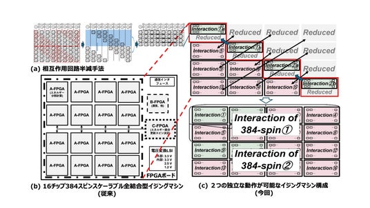 図 2. 今回開発した相互作用回路半減手法。規則性を持ちスケーラブル構造と親和性が高い。(a)相互作用回路アレーを4つに分割し2次元配置に規則性を持たせた相互作用回路半減手法。(b)従来の16チップを用いた384スピン全結合型イジングマシンのFPGAボード構成図。(c)スケーラブル構造と合わせた相互作用回路半減手法と、2つの独立した動作が可能な384スピン全結合型イジングマシンの構成。