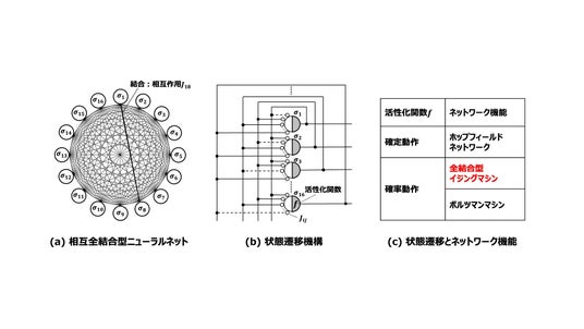 図1. 相互全結合型ニューラルネットワークの構造とそのスピン更新(状態遷移)機構。(a)要素であるσ_i(i=1∼16)スピンがあり、任意の2つのスピン間に双方向の相互作用J_ij (図ではi=1,j=8を太線で表示)がある。(b)スピンσ_iの値は2値をとるが、その更新をΣ_i J_ij σ_iの値を元に活性化関数で行い、ネットワークのエネルギーが下がる方向へ状態が遷移していく。(c)状態遷移の機構(b)において、その動作が確定動作か確率動作かでネットワークの遷移が異なる。