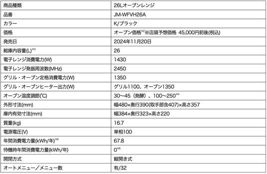 26Lオーブンレンジ「Milaly」(JM-WFVH26A)の概要は以下の通りです。