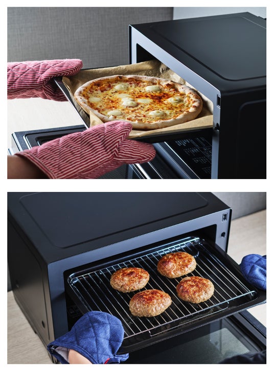 26Lオーブンレンジ「Milaly」(JM-WFVH26A)は、”レンジとグリル”、”レンジとオーブン”といった加熱機能を自動で切り替える「二刀流調理」機能を搭載。レンジでも使えるセラミック製の角皿を付属し、調理工程ごとのお皿のセットし直しや、手動で時間を測る手間もなく、材料を入れてオーブンレンジにおまかせすることで、簡単においしい料理に仕上がります。「揚げ物再加熱」メニューではレンジとグリルを自動切り替えし、衣はサクサク・中はあつあつの揚げたてのような美味しさを味わっていただけます。また角皿にセットできる焼き網を活用すれば、角皿式スチームで肉まんをふっくら仕上げたり、お肉の脂を落としてヘルシーに調理したりすることも可能です。