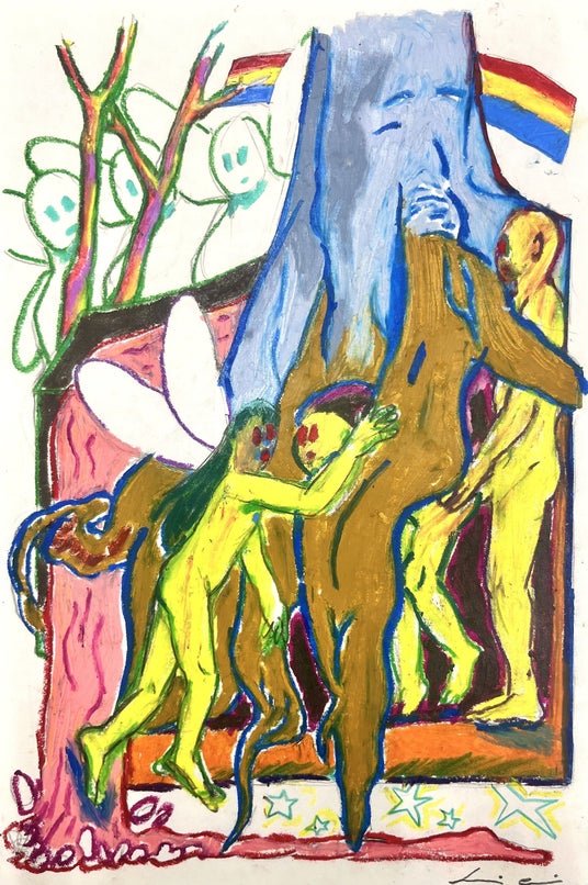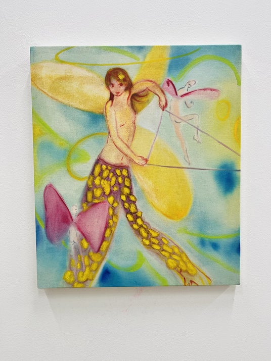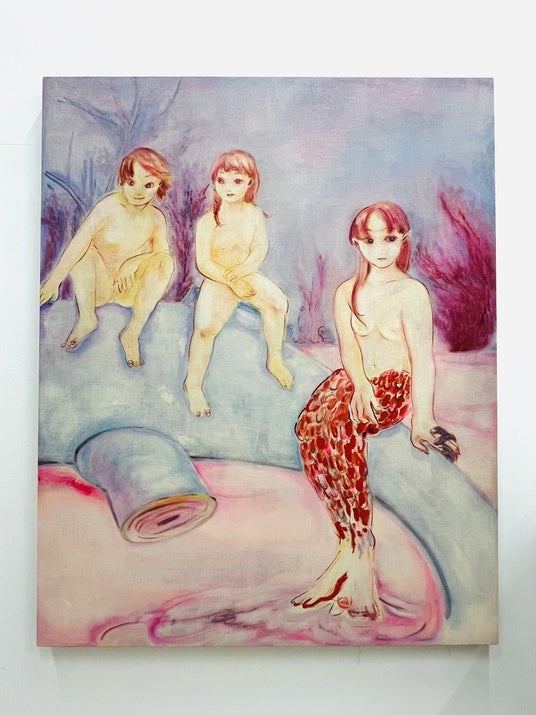 フカミが描く絵は、まるで絵本の世界を見ているような幻想的なモチーフや鮮やかな色彩で、観る人の心を引き込みます。何度も丁寧に重ねられた深い色の層からは、現代のリアルを再解釈したフカミ独自の感性や内に秘めた複雑な感情を表現しているようです。