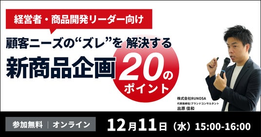 ブランドコンサルティング事業を展開する株式会社RUNOSA(本社:東京都渋谷区、代表取締役:出原佳和)は、2024年12月11日(水)15:00~16:00に「顧客ニーズの“ズレ”を解決する新商品企画のポイント20」セミナーをオンラインで開催します。本セミナーの講師を務める出原は、かつてUNIQLOで数々のヒット商品に携わり、現在は製造業や小売業において、企業が新たなステージに挑戦するため戦略から実行まで一貫した支援を提供しているコンサルタントです。セミナーでは、これまでの実績をもとに、現代の市場で「本当に求められる商品」を生み出すための実践的なアプローチを具体例を交えながら紹介します。