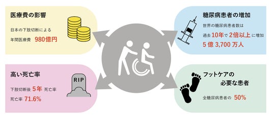 しかし、糖尿病患者の約57.1%は、下肢切断について自分事とは感じていない(自社調べ,2022年)という調査結果も出ており、早期発見や処置をすれば、切断に至らずに済むかもしれない患者が、 足潰瘍から下肢切断に至るケースが後を絶たないという厳しい状況が続いています。下肢切断後5年の死亡率は、他の合併症に比べて著しく高いことも分かっており、増え続ける糖尿病患者が一人でも多く、末梢神経障害に関する正しい知識を持ち、経過観察の過程で、医師と対話しながら予防策や対処策を実践していくことが急務となっています。
