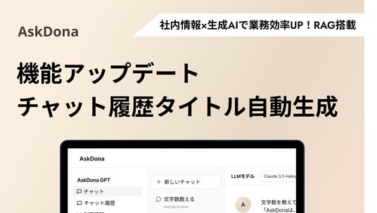 ChatGPTなどの生成AIツールは、様々なビジネスシーンで活用されています。しかし、生成AIとの会話は議事録のように残らないため、過去の会話履歴を再利用したい場合でも、探すのに苦労するケースがありました。AskDonaは、この課題を解決するため、チャット履歴に自動でタイトルを付ける機能を追加リリースいたしました。