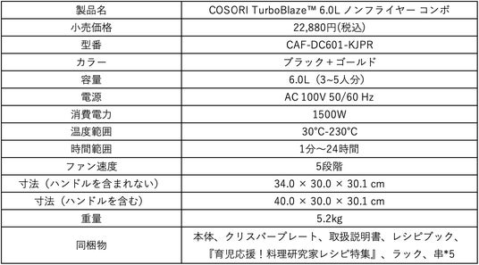 限定モデルは「COSORI TurboBlaze(TM) 6.0L ノンフライヤー」の以下特長を継承します: