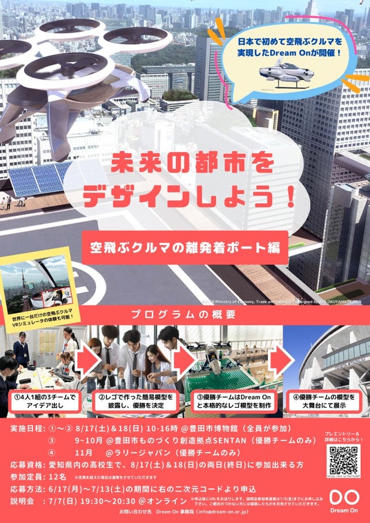 11月21日~24日にFIA世界ラリー選手権(WRC)フォーラムエイト・ラリージャパン2024が行われる豊田スタジアムにて、高校生が創造した「2040年の空飛ぶクルマのある街」の模型(以下 本模型)を展示します。この展示は、有志団体Dream On(代表:中村 翼、以下 Dream On)が、2024年8~11月に愛知県で行った次世代イノベーター育成プログラム「FLEX Park」の一環として実施するものです。なお本模型は、同イベントの「株式会社SkyDrive / 有志団体Dream On」出展ブースにて、株式会社 SkyDrive(以下 SkyDrive)の空飛ぶクルマSD-03展示機、およびDream Onの空飛ぶクルマVRシミュレーターと並んで展示されます。