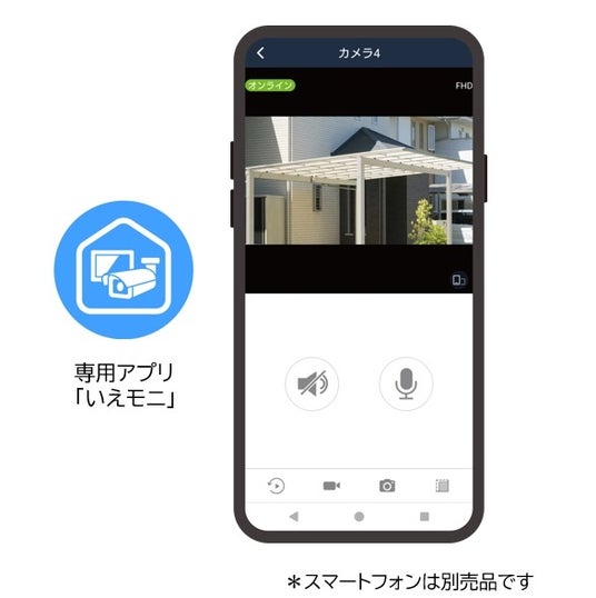 本製品は、屋外カメラとモニター親機のセットになっており、インターネット環境やスマートフォンがなくてもすぐに使用できます(※2)。インターネット環境があれば、新開発のスマートフォンアプリ「いえモニ」(※3)とスマートフォン(※4)と連携し、外出先から映像の確認が可能です。