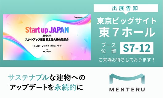 株式会社メンテル(本社:東京都渋谷区、代表:井上 智樹)は、「サステナブルな建物へのアップデートを永続的に」をミッションに掲げるスタートアップです。2024年11月20日(水)から21日(木)まで、東京ビッグサイトで開催される「Startup JAPAN EXPO 2024」に、ブース【コマ番号:S7-12】を出展いたします。