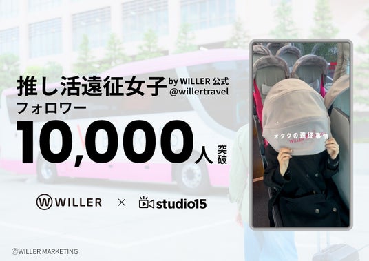 TikTokを中心としたショートムービー(短尺動画)領域で広告代理店事業・プロダクション事業を展開するstudio15株式会社(本社:東京都渋谷区、代表取締役:岩佐 琢磨、読み:スタジオフィフティーン、以下「studio15」)は、studio15がSNSアカウント戦略立案から企画・運用・分析までワンストップで支援をしているWILLER MARKETING株式会社(本社:大阪府大阪市、代表取締役社長:辻本 宗男、以下WILLER MARKETING)のTikTokアカウント「推し活遠征女子 by WILLER公式(@willertravel)」がフォロワー1万人を突破したことを発表いたします。