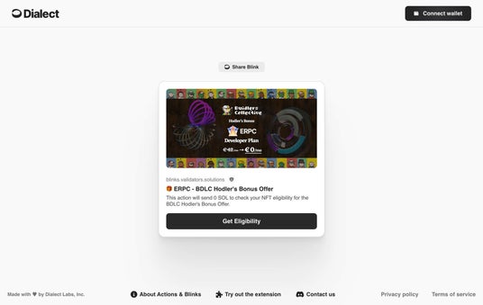 この特典の登録には、Solanaの新技術「Blinks」を活用しています。BDLC NFT ホルダーは、Validators DAO 公式 Discord (https://discord.gg/C7ZQSrCkYR) から特典 Blinks URLを発行し、NFTの入ったウォレットにてサインすることでプランの登録が完了します。