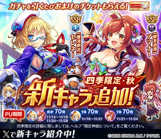 合同会社EXNOA(本社:東京都港区、CEO:村中 悠介、URL:https://games.dmm.com/)が運営するDMM GAMESにおいて『神姫PROJECT』は、「セレネー」「アマナー」が新衣装で登場する事を発表した。さらに11月11日よりプレミアムパスの特典が更新された。