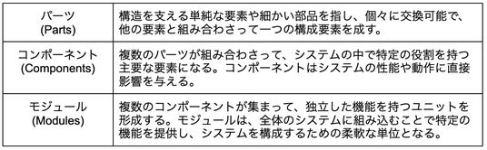 下記の図は、「parts」「components」「module」が実際にどのように翻訳されているのかを説明したものです。