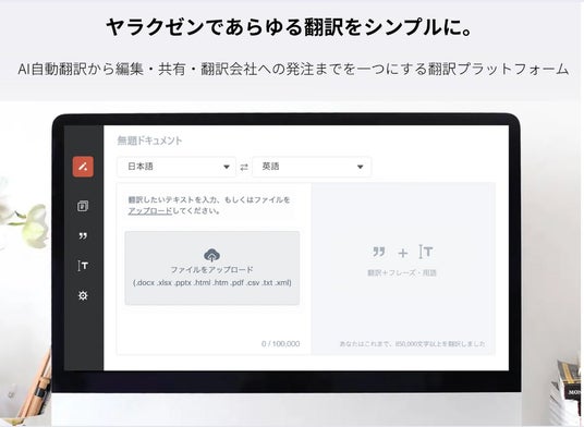ヤラクゼンとはヤラクゼンは、AI翻訳から編集・共有、翻訳会社への発注までを一つにする翻訳プラットフォームです。誰でも直感的に使えるシンプルなインターフェースと、AIにより使えば使うほどパーソナライズされる高品質の機械翻訳、強固なセキュリティが特徴です。