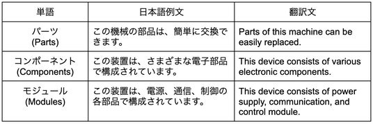 日本語の「部品」という単語は、英語では「parts」「components」「module」などと翻訳されます。それぞれの単語が持つ意味が異なるため、製品マニュアルを翻訳する必要があるIT関連の部品企業などでは、正確な使い分けが求められます。