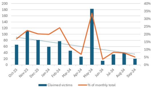 2022年から2023年にかけて、ランサムウェアの被害件数が全体の40%を占めていたLockbitは、この数カ月、運用能力が急激に低下しています。2024年9月、Lockbitによる新規の被害件数は20件で、全体の5%まで激減しました。これは過去数年の最盛期と比べると大幅な減少となっています。