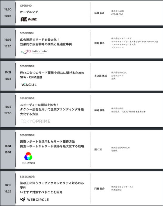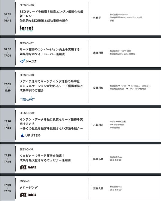 合計9社*のリード獲得のスペシャリストにお集まりいただき、SEO・広告・メディア活用を始めとした各施策の最新トレンドの観点からリード獲得を倍増させるための具体的な施策をご提案いたします。