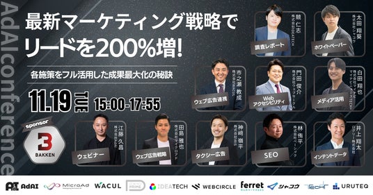 株式会社AdAI(代表取締役:江藤久昌)は11月19日にBtoBマーケティング担当者向けに「最新マーケティング戦略でリードを200%増! 各施策をフル活用した成果最大化の秘訣」を開催いたします。