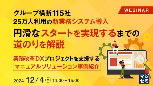 マジセミ株式会社は「グループ横断115社25万人利用の新業務システム導入、円滑なスタートを実現するまでの道のりを解説」というテーマのウェビナーを開催します。