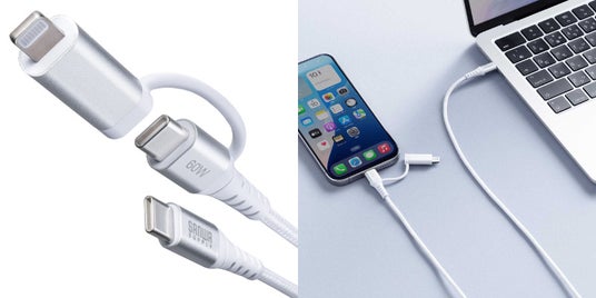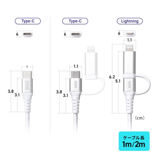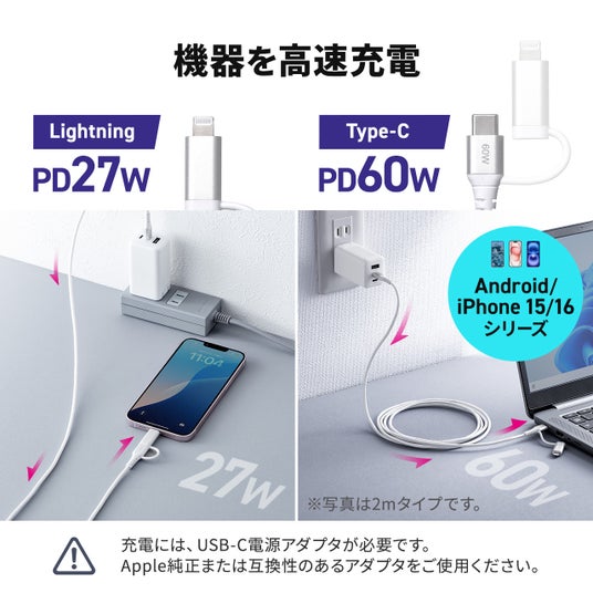 USB Type-CとLightningの2つのコネクタが付いているこのケーブルは、デバイスに応じて使い分けが可能です。充電のコネクタがiPhoneなどのライトニングコネクタとType-Cコネクタのスマホがある場合でも、このケーブルが1本あればType-C充電器と組み合わせてどちらのスマホも充電できます。
