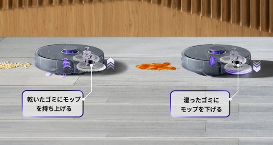 リビングルームに落ちたペットの毛や、キッチンでこぼれた食べ物のカスなどを認識し、強力吸引モードに自動で切り替え、モップをリフトアップし清掃を行います。牛乳やコーヒーなどの液体汚れの場合は、メインブラシが持ち上がり、吸引とサイドブラシが停止、モップを下ろして水拭きをします。
