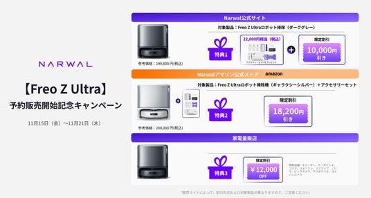 創立以来、より良い暮らしに繋がる技術を磨き続け、より効率的かつより革新的な床清掃技術の開発に取り組み続け、最も優れたイノベーションを表彰する「エジソン賞」を受賞したNarwalは、11月15日より、業界初*のデュアルRGBカメラとデュアルAIチップを搭載した「Freo Z Ultra」をNarwal公式サイト、Amazon公式ストア及び各家電量販店店頭および量販店ECサイトにて予約開始いたしました。