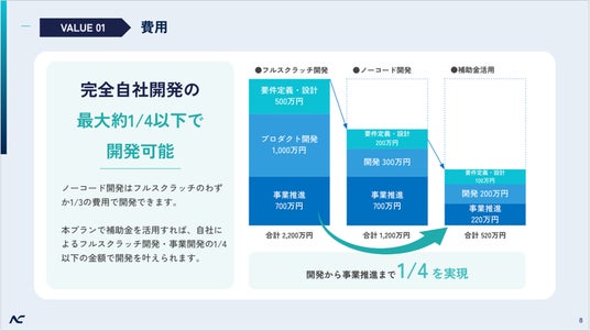 フルスクラッチのわずか1/3の費用で開発できるノーコード開発に加えて、本プランで補助金を活用することができれば、通常のフルスクラッチ開発・事業開発の1/4以下の金額で開発を行うことが可能になります。
