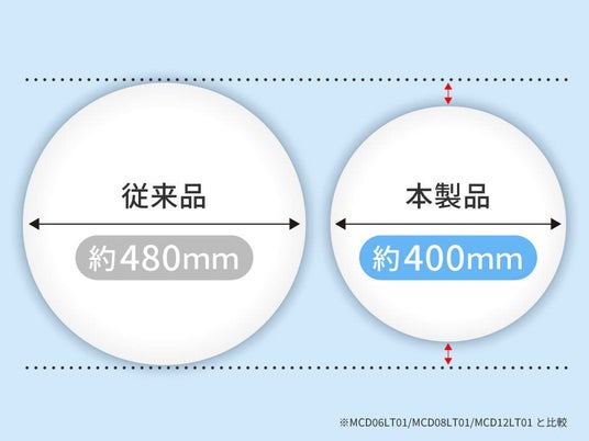 従来品から直径にして約80mmと、ひと回り小さくなり、コンパクトなサイズになりました。台所や廊下、狭いところでも使用することができます。