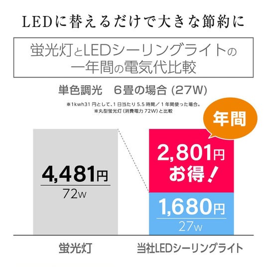 LEDの発光効率は126lm/w、省エネ基準達成率は125%で、お財布にも環境にも優しい仕様となっております。なお、電気料金を1kwh31円(※1)として、1日あたり5.5時間、1年間使用した場合(※2)、丸形蛍光灯(消費電力72W)と比較して2,801円お得になります。