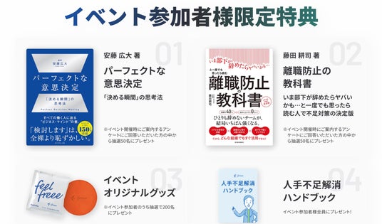 参加者特典として、参加アンケートに回答いただいた方から抽選でのプレゼントや、参加者全員へ「人手不足解消ハンドブック」をご用意しています。