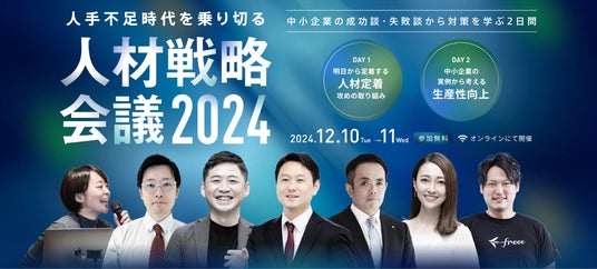 フリー株式会社(本社:東京都品川区、CEO:佐々木大輔、以下「freee」)は12月10日・11日の2日間に「人手不足時代を乗り切る 人材戦略会議2024 ~中小企業の成功談・失敗談から対策を学ぶ2日間~」をオンライン開催します。