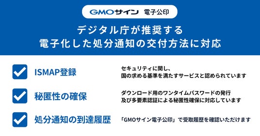 GMOグローバルサイン・ホールディングス株式会社(代表取締役社長:⻘山 満 以下、GMOグローバルサイン・HD)は、自社が運営する行政向け電子公印サービス「GMOサイン電子公印」に、デジタル庁が全国の官公庁・自治体向けにガイドライン(※1)で提唱する、電子化された処分通知の交付方法に求める機能を実装いたしました。