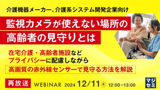 マジセミ株式会社は、大変好評をいただいた「【再放送】介護機器メーカー、介護系システム開発企業向け 監視カメラが使えない場所の高齢者の見守りとは」というテーマのウェビナーを再放送します。