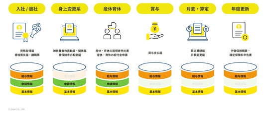 人事情報を1つに統合した「Core HRデータベース」によって、勤怠集計からの給与計算や、社会保険手続きに関する帳票類の入力といった定型業務の効率化・自動化を支援します。