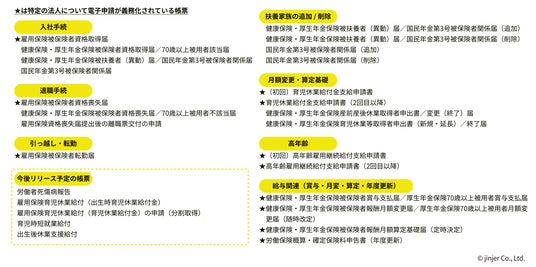 ジンジャー人事労務で、入社~退社までに行う社会保険関連の手続きにおいて電子申請が義務化されている主要な帳票全てがジンジャー上で電子申請可能に