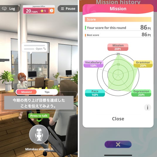 Buddyセッションで英会話そのものへの自信がつけつつ、よりレベルの高く実用的な、実務シーンをベースとしたAIとの英会話トレーニングにも取り組んでいただきます。対人だと心理的障壁を高く感じる、ビジネスシーンでの英会話トレーニングも、AIが相手であれば、気軽に・いつでも・何度でもトレーニングができます。さらに、ロールプレイング形式でシーンにマッチした空間に没入しつつ、トレーニングをすることで、実際のシーンに近い環境下での学習を実現します。トレーニング終了後には、英語スキルのスコアが表示され、今後の学習に活かすことができます。
