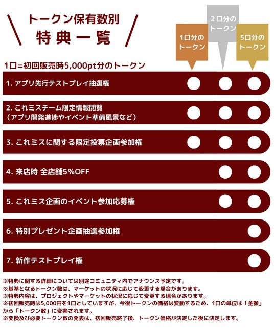 支援者にはトークンが配布され、トークンを持ち続けることで「店舗5%OFF」や「これミスに関する限定投票企画参加権」など、様々な保有特典を得ることができます。