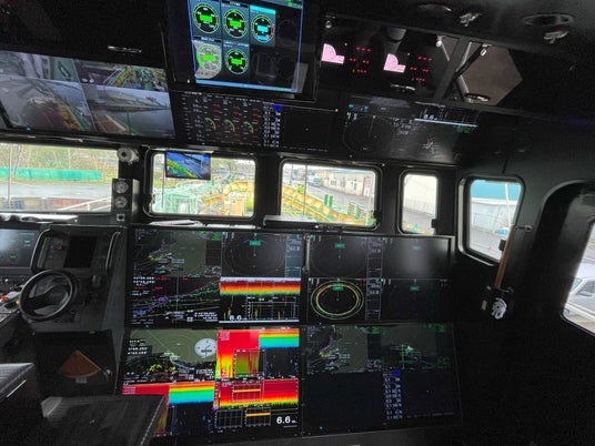 また、実際に漁を行う際には、魚群探知機(以下、魚探)やスキャニングソナーを使用して魚群の探知や動向の観察、さらには海底の状況を確認し、潮流計を見ながら網がどのように広がるかを確認しながら操業します。その結果、漁労長や航海士は航海用から漁労用に至る数十台の電子機器やシステムを状況に応じてそれぞれの画面を確認しています。本システムの搭載により、これまで個別で確認していた各種電子機器をネットワークで繋ぎ、その時に必要な情報を必要なタイミングで一番見やすいモニター上に映し出すことが可能になりました。