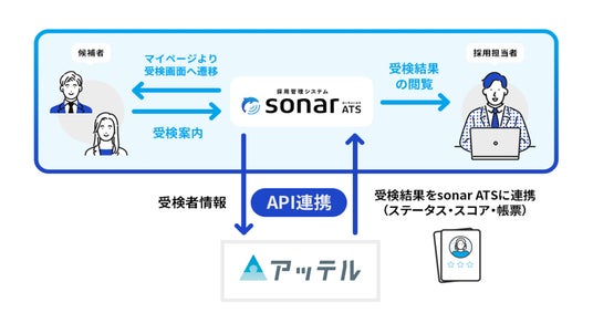 「sonar ATS」と「アッテル」のAPI連携は、「sonar ATS Developers」にて公開したWeb検査ツール向けAPIを利用したシステム連携です。今回の連携により、対応工数の削減をはじめ、受検~結果の選考への反映がよりスムーズになるなど、採用担当者と候補者、双方にとってメリットが生まれます。「アッテル」における採用管理システムとのAPI連携は「sonar ATS」が初となります。
