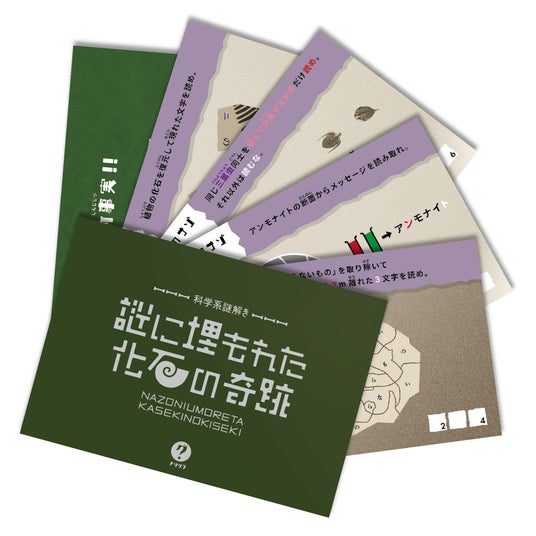 緑の封筒の中には謎が散りばめられたポストカードが5枚。化石に関する様々な謎が記されています。化石調査員のワクワクや苦労を体験できるゲームとなっています。