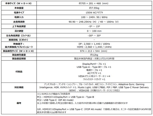 「MAG 325CQRF QD E2」は湾曲パネルを採用した31.5インチの大画面で包み込まれるような高い没入感が特徴です。湾曲率は肉眼とほぼ同じ1,000Rで、使用者の視界を覆うため集中力が高まりやすく、プレイヤーのパフォーマンスを高く引き出すことができます。また、色純度が高く広色域を実現する量子ドット技術を採用し、フルHDの約1.8倍の情報量で高精細な表示が可能なWQHD(2,560 × 1,440)解像度、引き締まった黒を表現可能な高いコントラスト比と高速応答を実現したRAPID VAパネルを搭載し、先代の「MAG 325CQRF-QD」からはリフレッシュレートと応答速度がそれぞれ180Hz / 0.5ms(GTG)へ性能向上したことにより、高いゲーミングスペックかつ高画質と高い没入感を両立したゲーム体験を楽しめます。その他の機能として、USBハブ機能やDP Alt Mode対応のUSB Type-Cポートを備えたノートPCとHDMIやDisplayPortで接続したデスクトップPCのマウスやキーボードをシームレスに切替可能なKVMスイッチを搭載し、最大65WのUSB Power Delivery機能によりノートPCなどに給電も可能です。