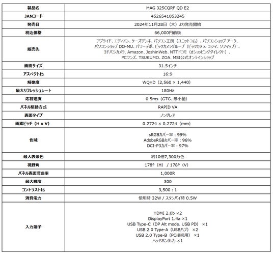 量子ドット技術で色純度の高い映像を楽しめる高画質ゲーミングモニター31.5インチ・WQHD・180Hz・0.5ms(GTG)のハイスペックモデル「MAG 325CQRF QD E2」発売