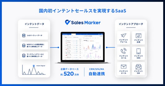 『Sales Marker』は、520万件を超える法人データベースと企業のインテントデータを組み合わせる事によって、今まさに自社のサービスを求めている企業を見つけ出し、キーマンに直接アプローチすることができるSaaSサービスです。