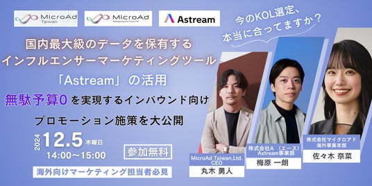 株式会社A(読み:エース、代表取締役CEO:中嶋泰、以下、当社)が提供する、インフルエンサーマーケティングツール「Astream(エーストリーム)」は、株式会社マイクロアド(本社:東京都渋谷区、代表取締役 社長執行役員:渡辺健太郎、以下「マイクロアド」)と、現地法人MicroAd Taiwan,Ltd.(本社:台北市、董事長:丸木勇人、以下、マイクロアド台湾)とともに、海外向けのマーケティング担当者に対し、無料ウェビナーを開催いたします。