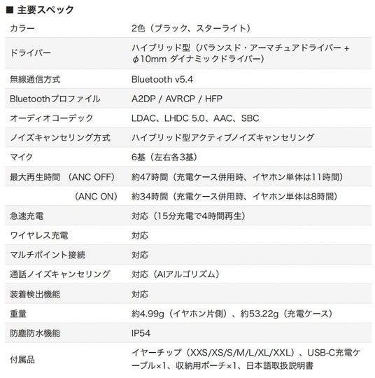 オーディオコーデックにはSBCとAACにくわえLDACをサポート、SBCの約3倍の情報量に相当する990kbpsという帯域幅を活かし、ダイナミックレンジが広く緻密なサウンドを実現します。LHDC 5.0にも対応、最大192kHz/24bitのオーディオ再生が可能です。一般社団法人日本オーディオ協会が定めるハイレゾオーディオワイヤレス規格の認証も取得しています。